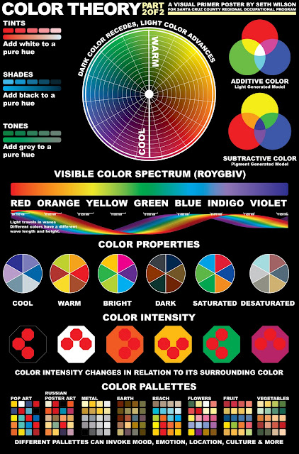 In my example I chose a chart that also explains and expands on some of the points made in our reading about color theory and also illustrated them in a different way. It explains how to create tints, shades and tones. Our reading had covered tints and shade, but it did not cover how to create a tone. I like that this chart has something new to offer to our reading. It also gives examples of color palettes that one may use in a project. I also like how in the color wheel they highlight the warm and cool colors on the wheel. I know that I sometimes struggle in deciding how warm or cool a palette should be for certain projects and how it would look together. I believe that this is a nice tool that is provided on the infographic.